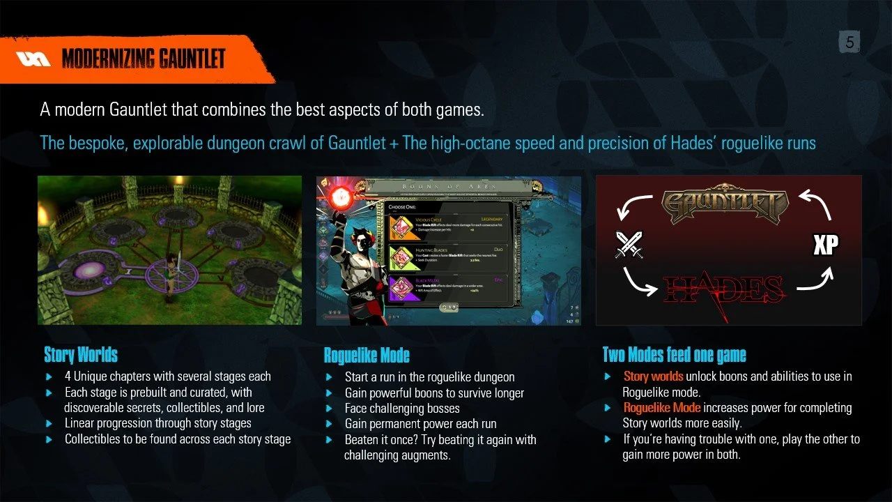 This pitch was one I did as a modernization of the Gauntlet IP for Warnerbrothers. It had been over 10 years since the last installment had come out and our studio had a working partnership with WB. The time was ripe to pitch a project that was perfectly suited to the size of the studio as well right in the sweet spot for the level of investment WB was looking to make at the time.